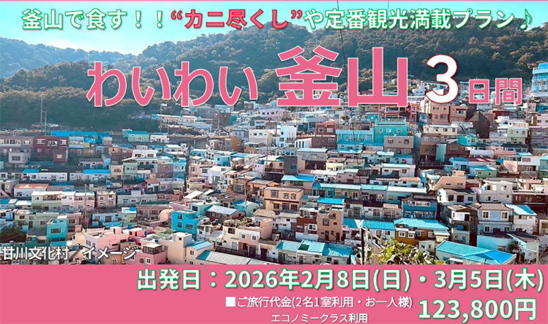 - 123,800円(2名1室利用・お一人様料金、エコノミークラス利用) 【お一人部屋追加代金15,000円(2泊)】