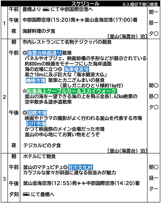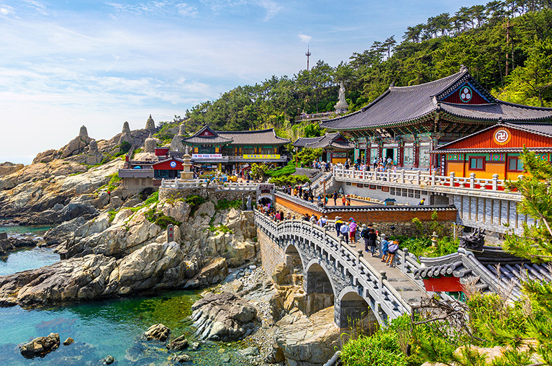 映画をモチーフにした海岸道路の海雲台映画通りや海の岩場に建つ海東竜宮寺、昼食後には絶景の松島海上ケーブルカーとスカイウォークや釜山の中心地にある国際市場・BIFF市場へご案内します。