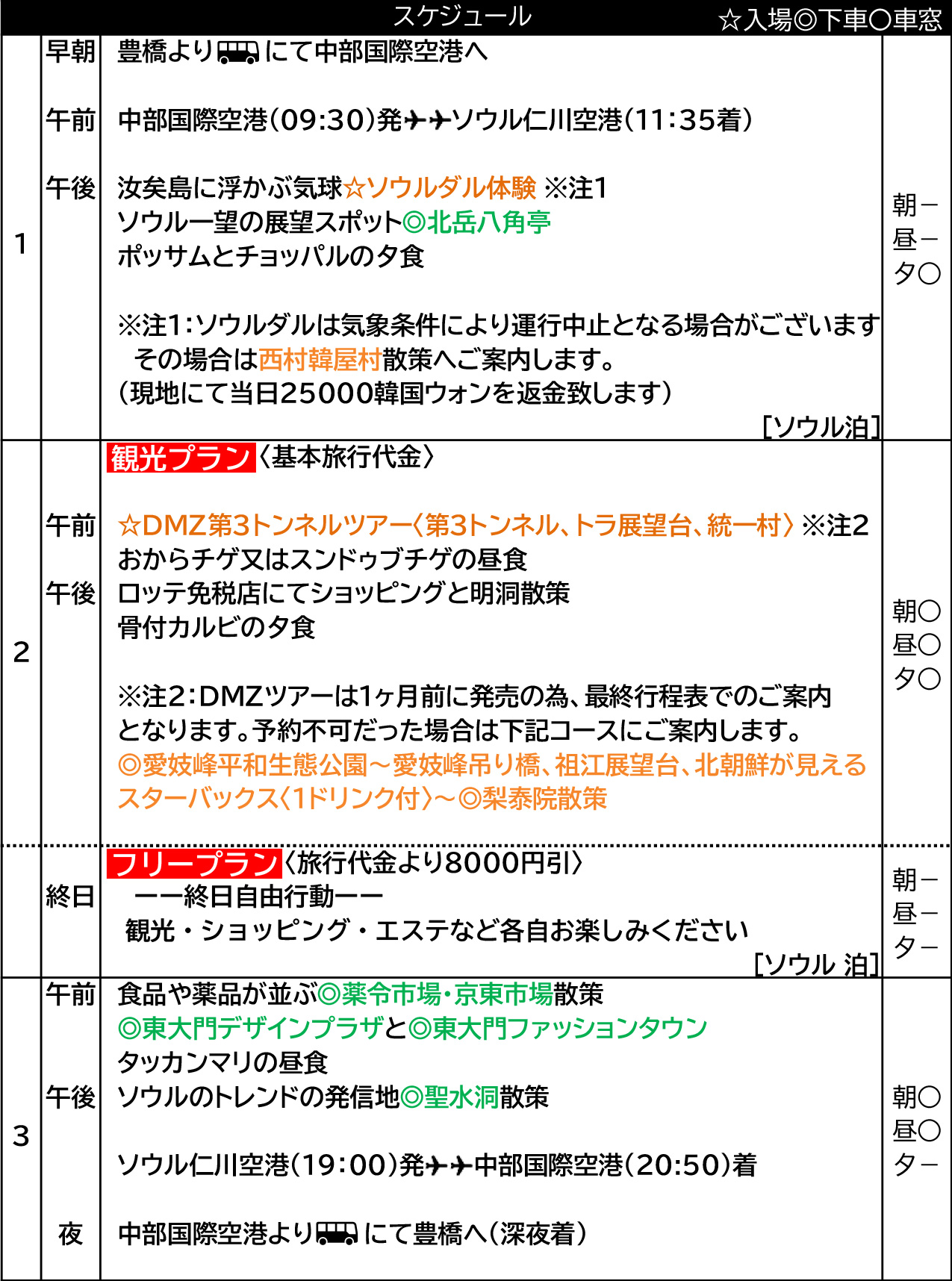 DMZツアーは1ヶ月前の発売の為、予約不可となった場合は愛妓峰平和生体公園等にご案内します(表面スケジュールをご覧ください)
